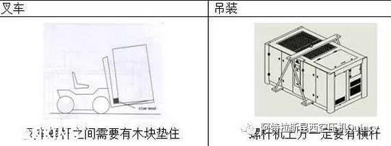 螺桿空壓機在安裝前需要放置在指定位置,在運輸放置過程中可以使用叉車或者吊裝的方式進行運輸放置,但是需要注意操作方式需按下圖展示要求進行。
