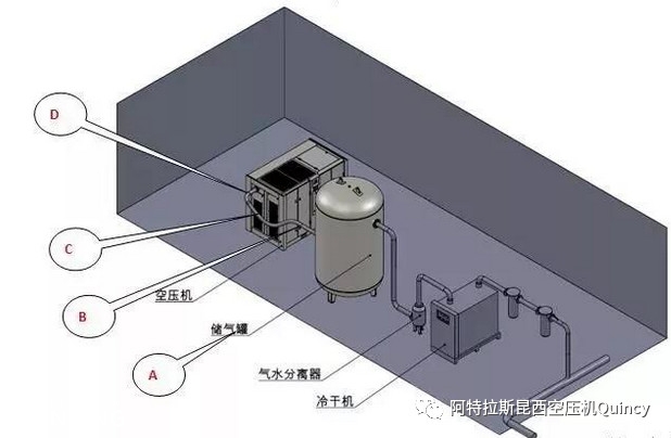A)配套設備安裝順序要求如圖,“空壓機→儲氣罐→氣水分離器→冷干機”的安裝順序能有效利用氣體流動特性提前排出水分降低冷干機負荷。
